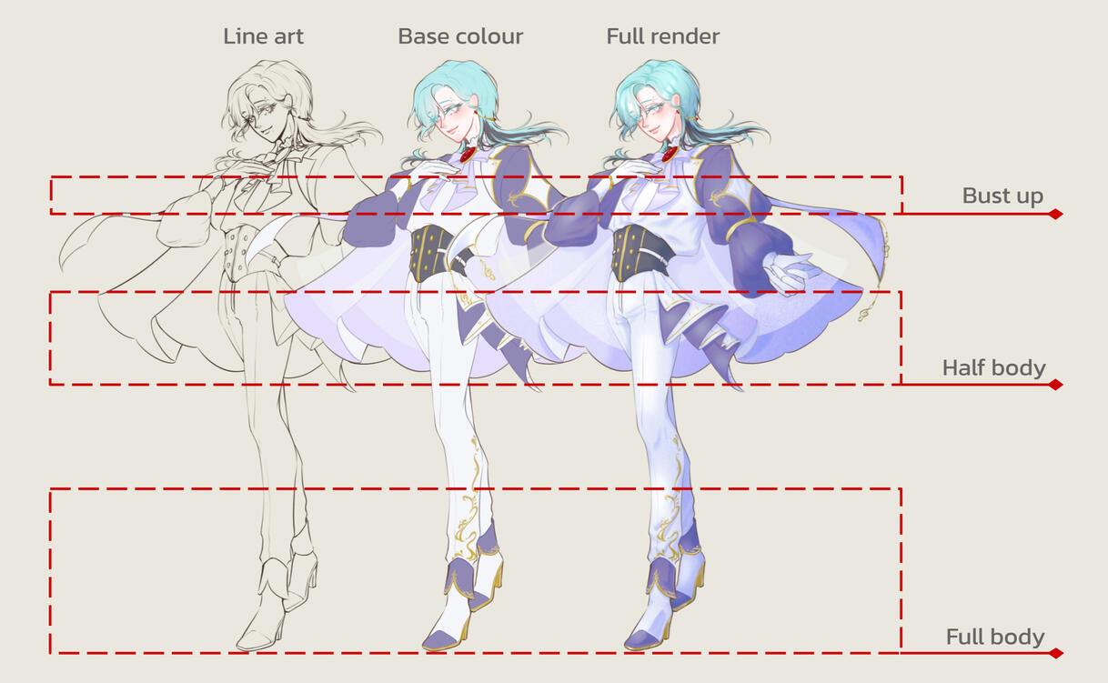 2. Calculate the price Start when paid half or full payment3. Update work process Draft ( check compo ) -> Sketch -> Line art -> Base -> Colour I'll skip line art process for the Colour A4. Double-check before sending work.5. Sending files I'll be sending as files .png or .jpg